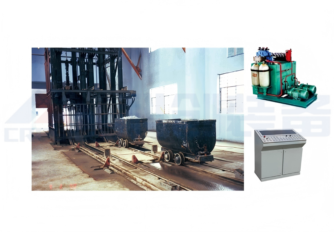 井口操車系統(tǒng)分立井操車系統(tǒng)和斜井操車系統(tǒng)兩種,本節(jié)主要介紹立井操車系統(tǒng)。立井操車系統(tǒng)應(yīng)用于立井 的井口或井下各水平的車場,可方便的執(zhí)行推車、卸車、限位、調(diào)運礦車等功能,并可較好的實現(xiàn)推爪進(jìn)罐,操 車工藝先進(jìn),工作效率極高。 立井操車系統(tǒng)由推車機(jī)、阻車器、搖臺、安全門、集中控制液壓站、操車電控系統(tǒng)等部件組成, 操車系統(tǒng) 的各組成設(shè)備均為電液動力,采用 YKC 型雙機(jī)雙泵集中控制液壓站提供動力,并通過 KJH124 型操車電控系統(tǒng) 實現(xiàn)集中控制,并可與副井提升信號系統(tǒng)實現(xiàn)電氣閉鎖,極大地提高了井口操車系統(tǒng)的自動化水平。